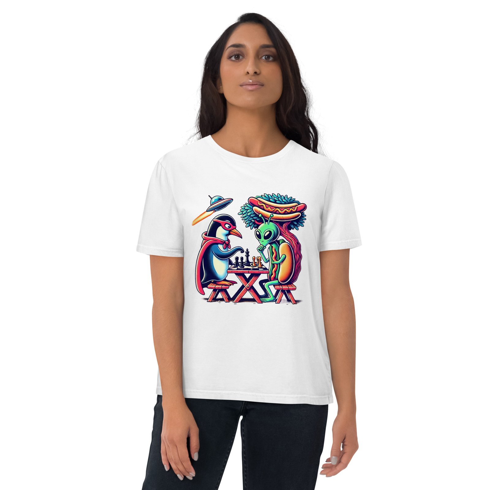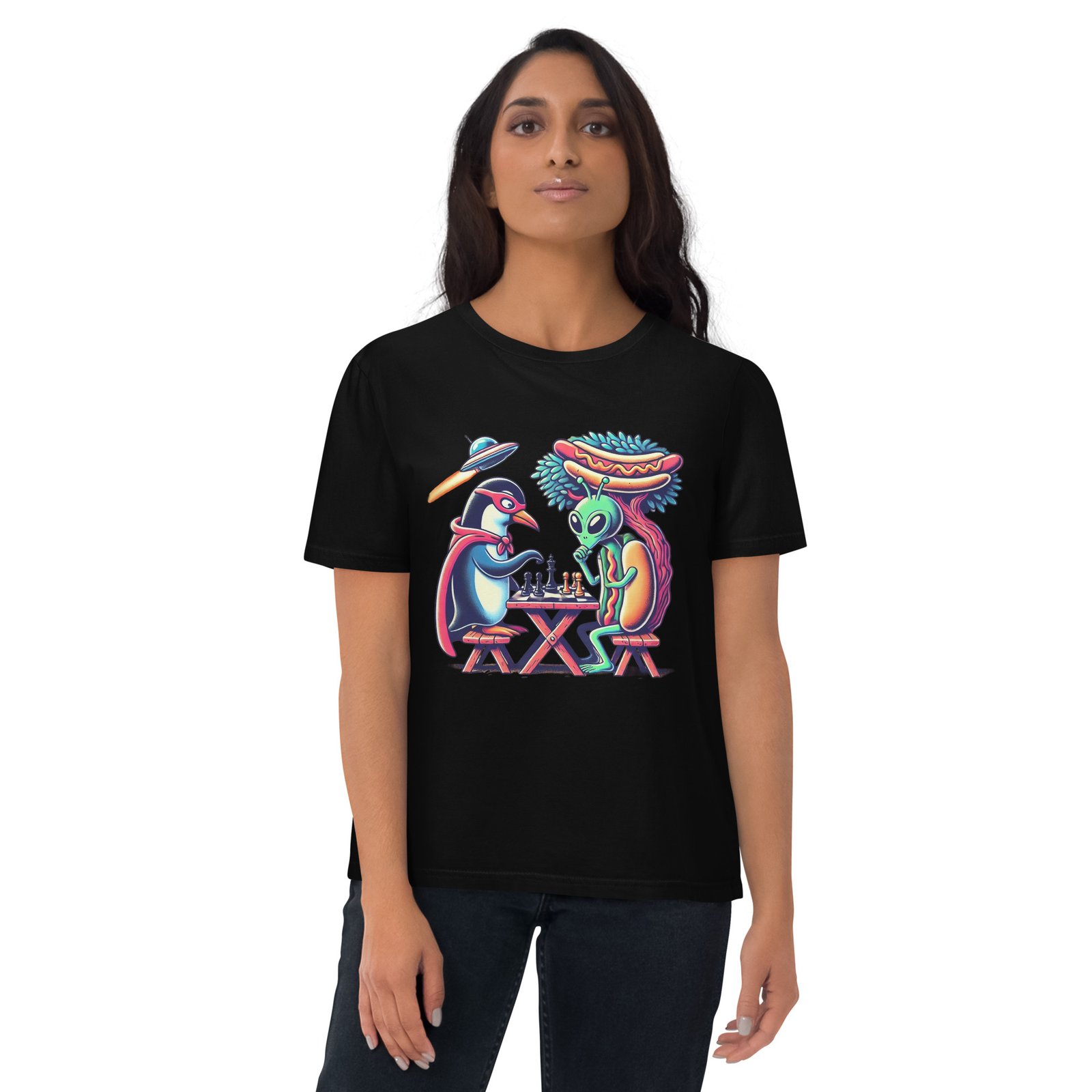 Lleva el juego de ajedrez a otra dimensión con nuestra camiseta ‘Ajedrez Cósmico’. Este diseño único presenta a un pingüino y un alienígena sentados frente a un tablero de ajedrez en un duelo intergaláctico. Con sombreros y un estilo surrealista, esta camiseta es perfecta para los amantes del ajedrez y la ciencia ficción. Ideal para destacar y mostrar tu lado divertido y curioso, ¡esta prenda es una declaración de estilo para mentes creativas!