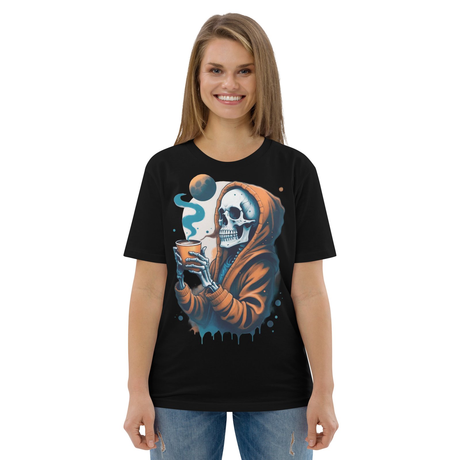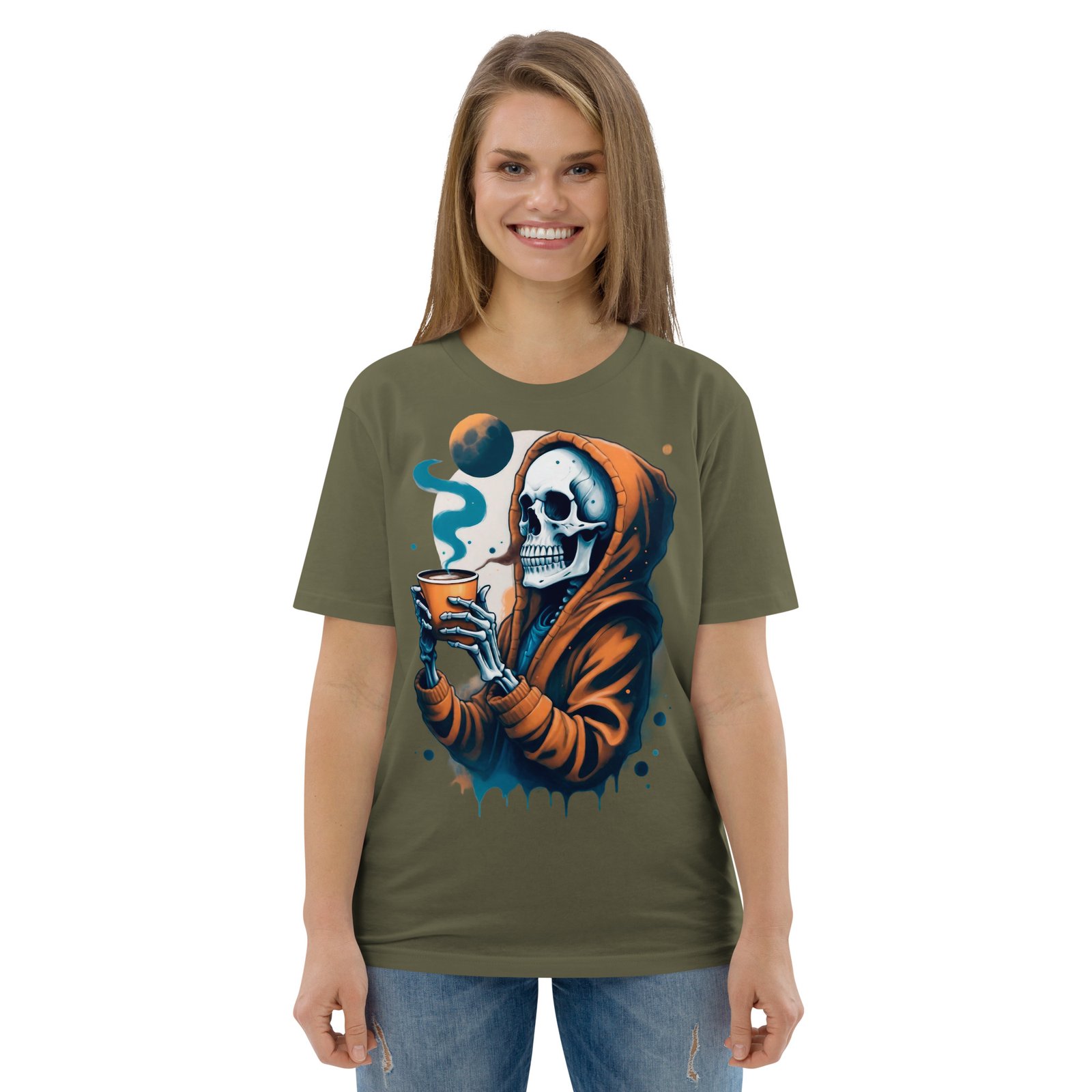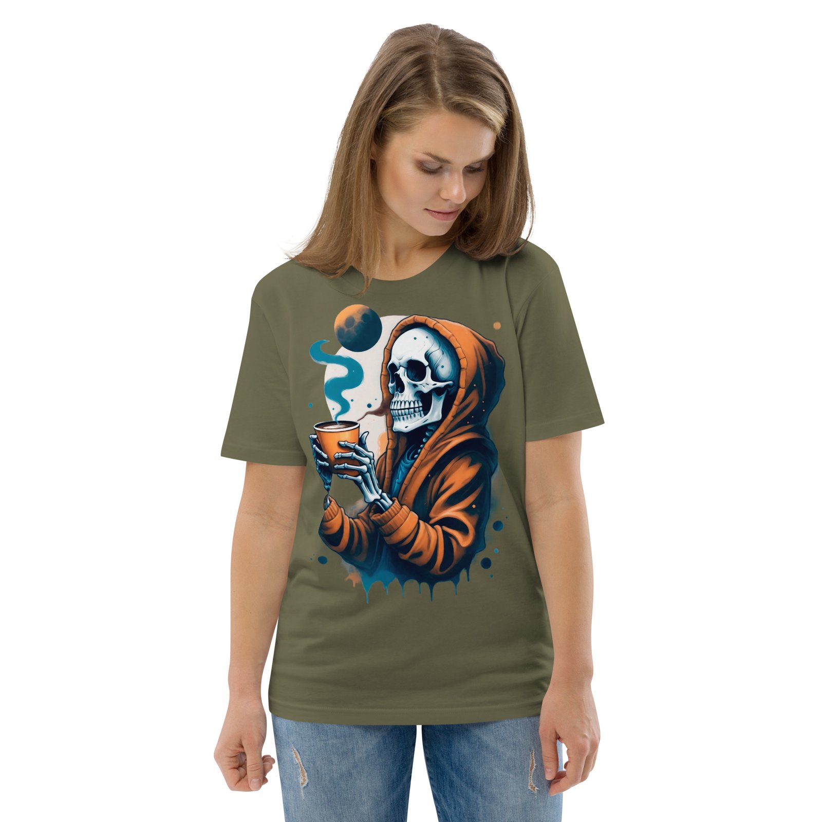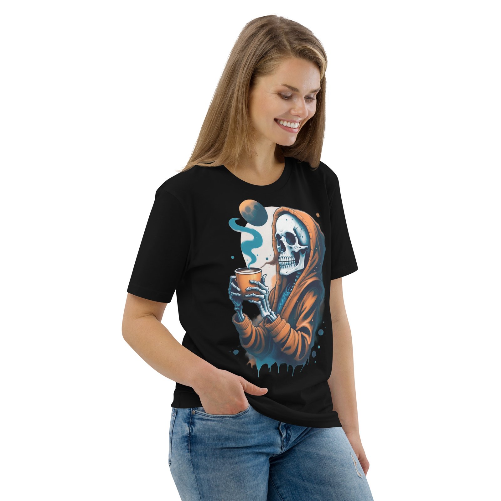 Disfruta de la oscuridad con estilo con nuestra camiseta ‘Café con la Muerte’. Este diseño presenta una calavera en una sudadera tomando una bebida caliente, perfecta para los amantes de lo macabro y el misterio. Con detalles sutiles de humo y tonos oscuros, esta camiseta es ideal para quienes quieren expresar su lado alternativo y relajado. Perfecta para la temporada de otoño o invierno, añade un toque de humor oscuro a tu estilo casual.