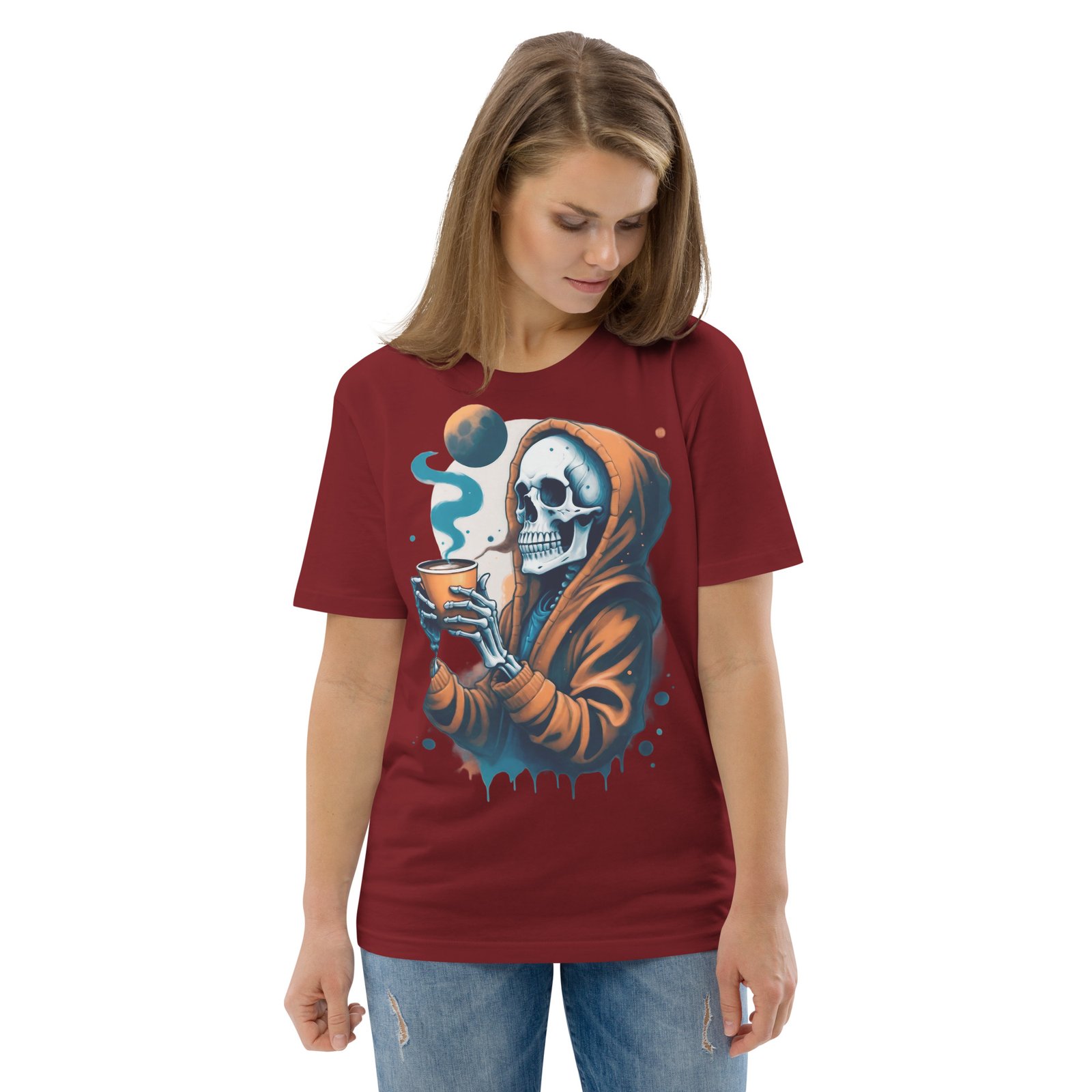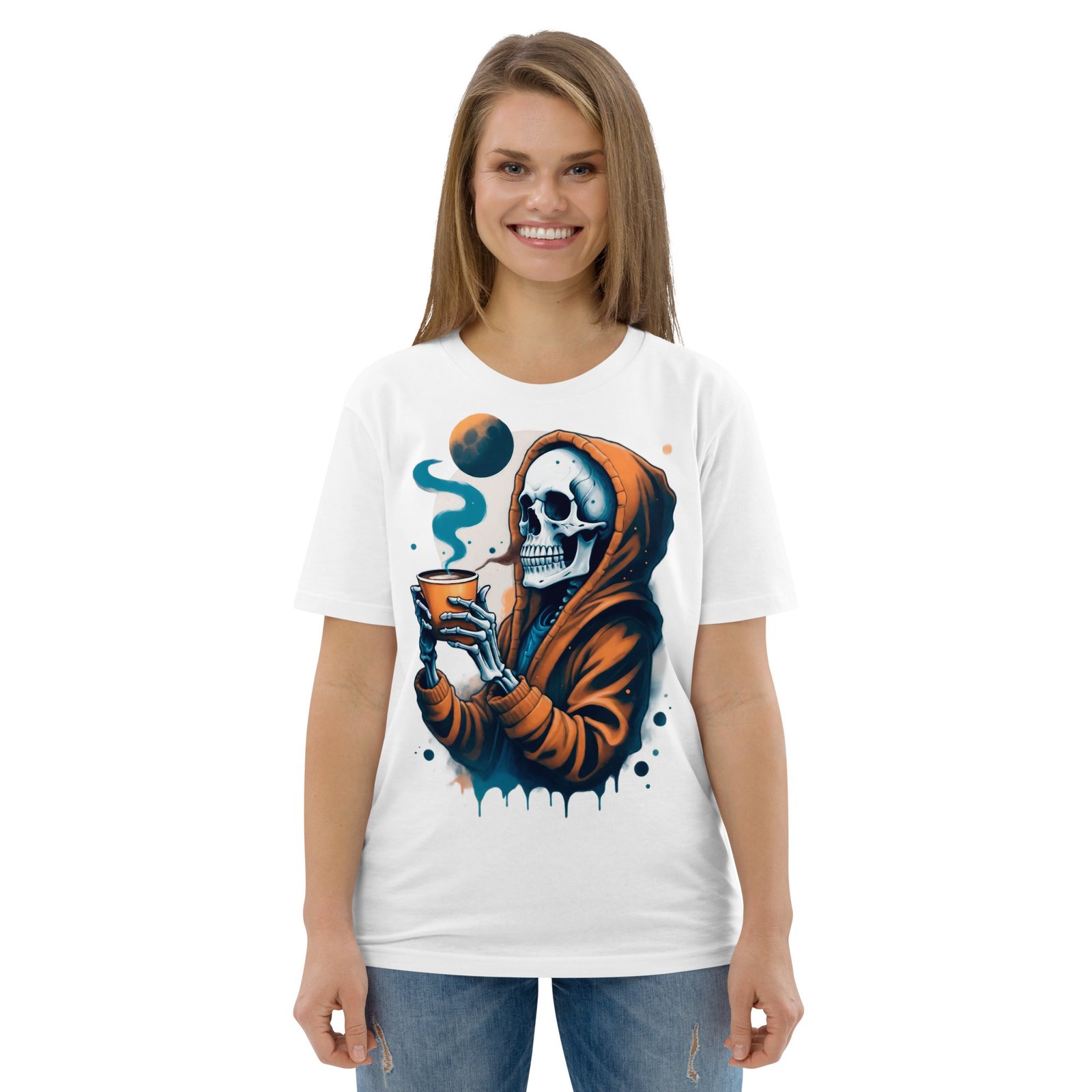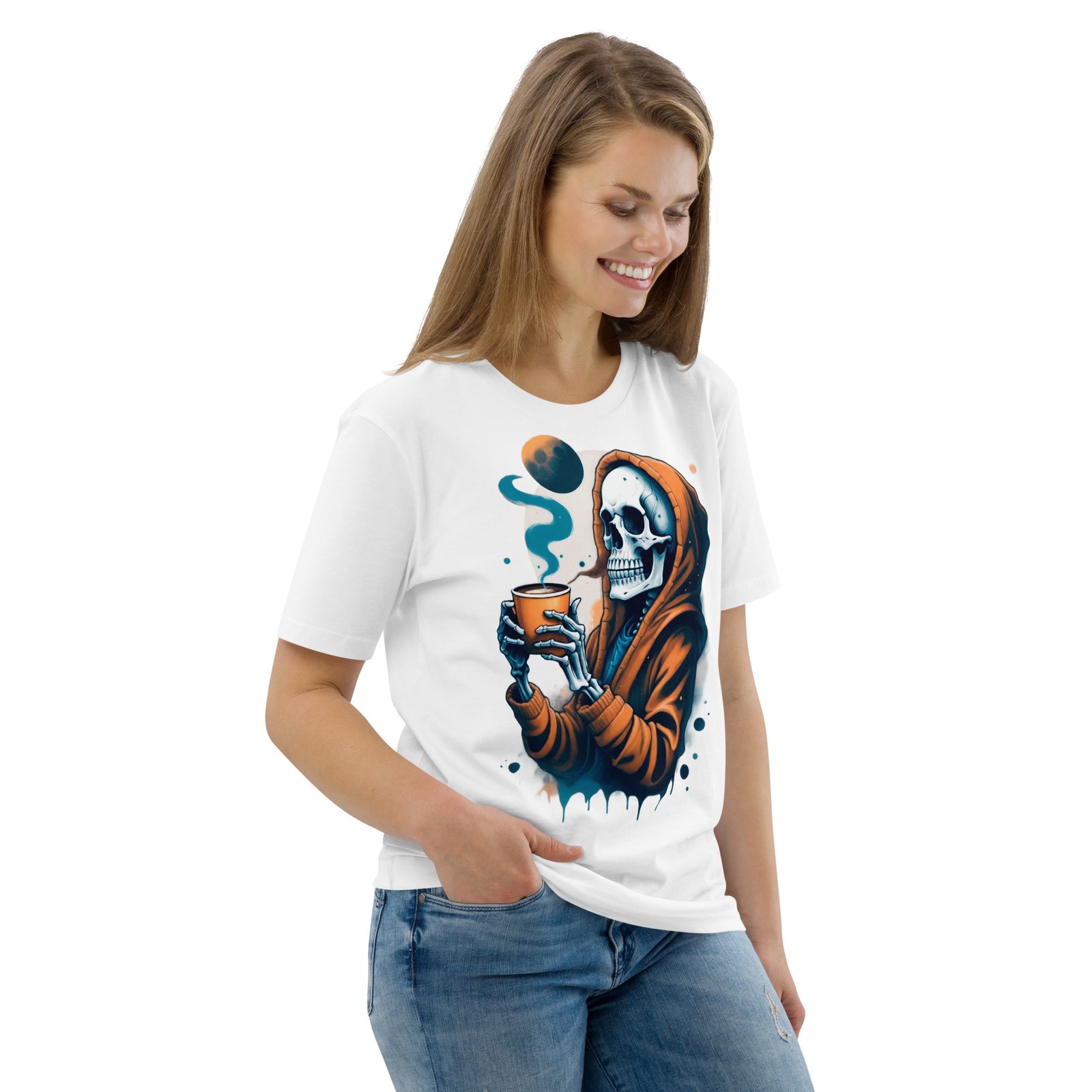 Disfruta de la oscuridad con estilo con nuestra camiseta ‘Café con la Muerte’. Este diseño presenta una calavera en una sudadera tomando una bebida caliente, perfecta para los amantes de lo macabro y el misterio. Con detalles sutiles de humo y tonos oscuros, esta camiseta es ideal para quienes quieren expresar su lado alternativo y relajado. Perfecta para la temporada de otoño o invierno, añade un toque de humor oscuro a tu estilo casual.