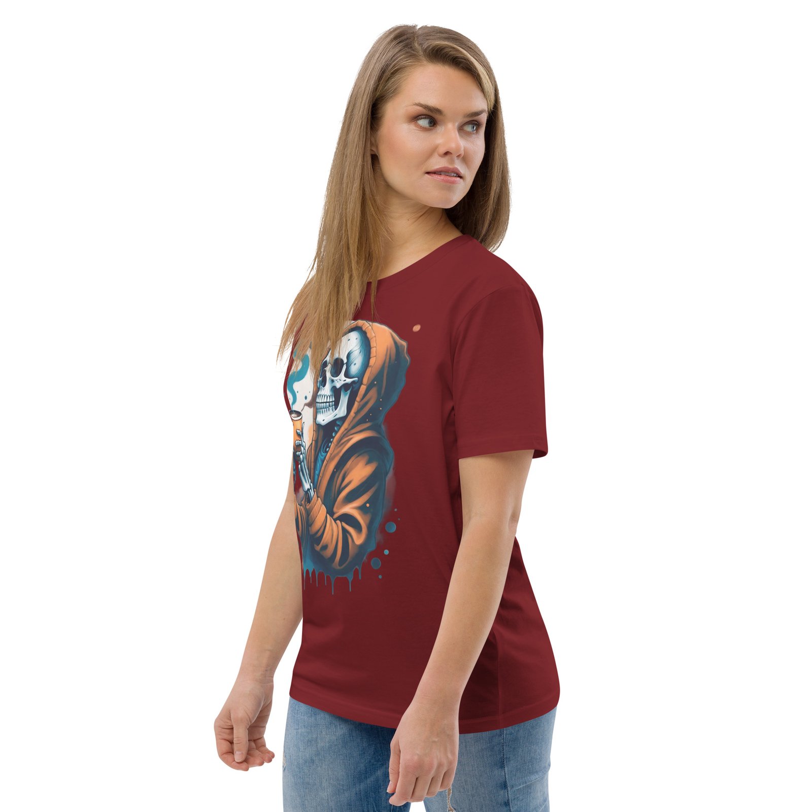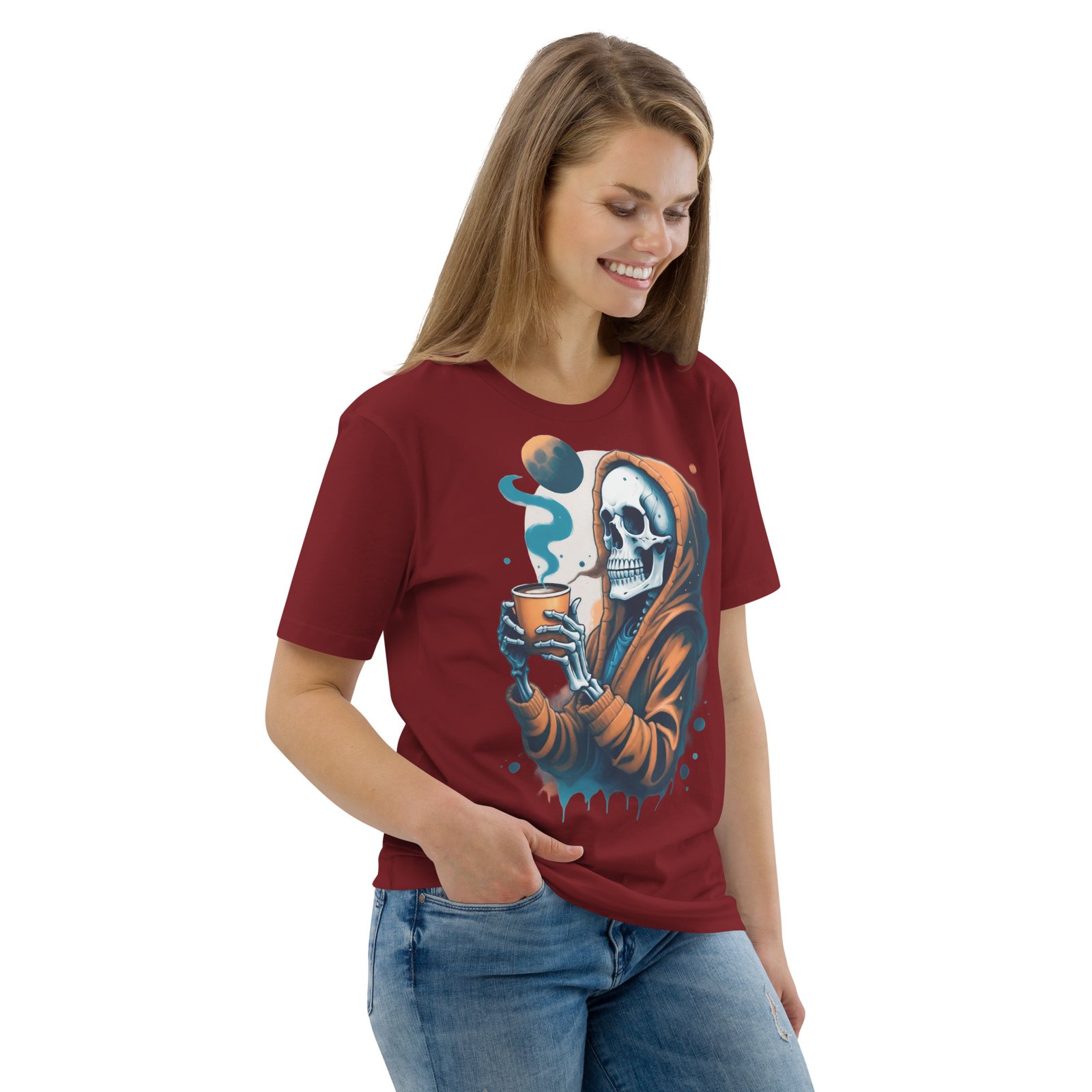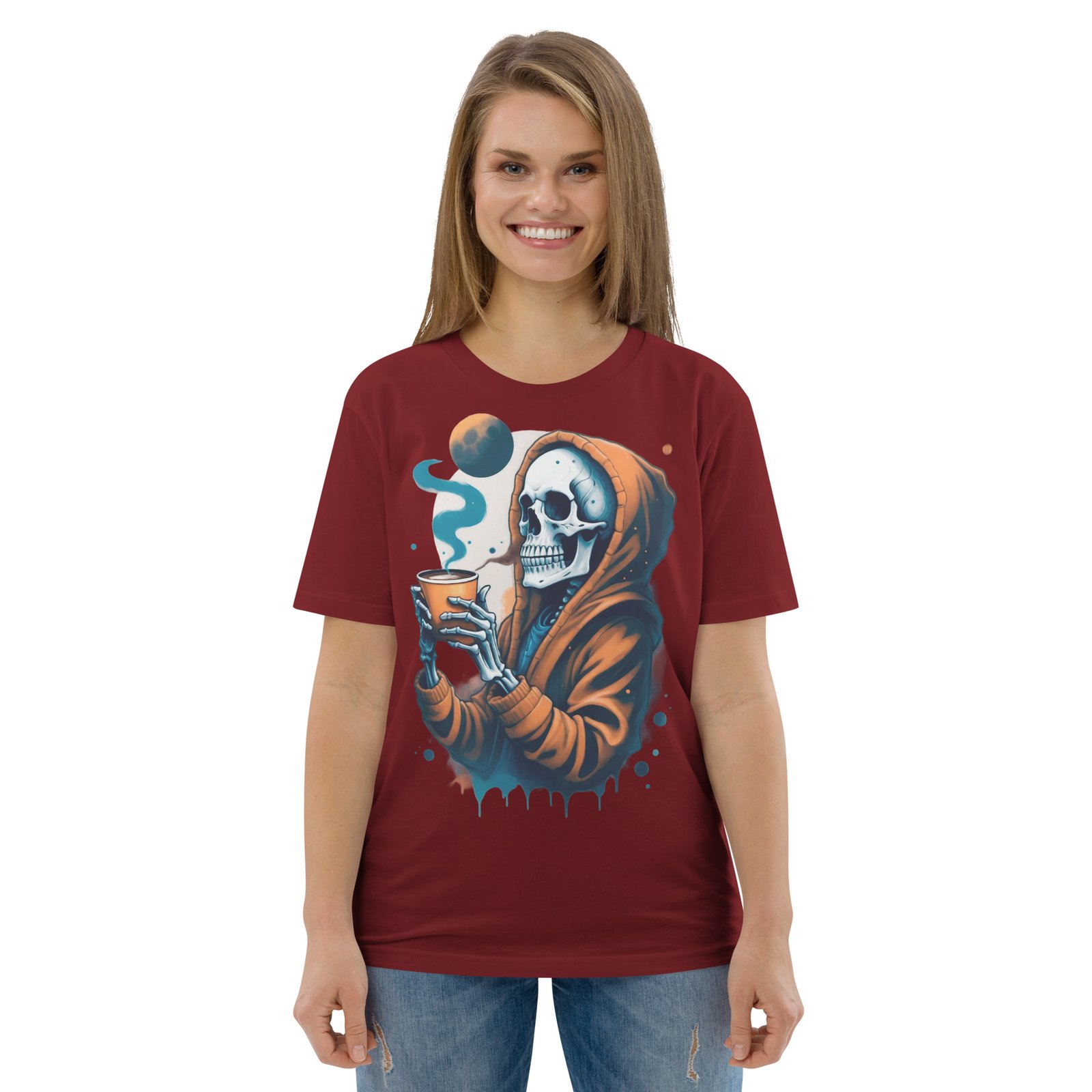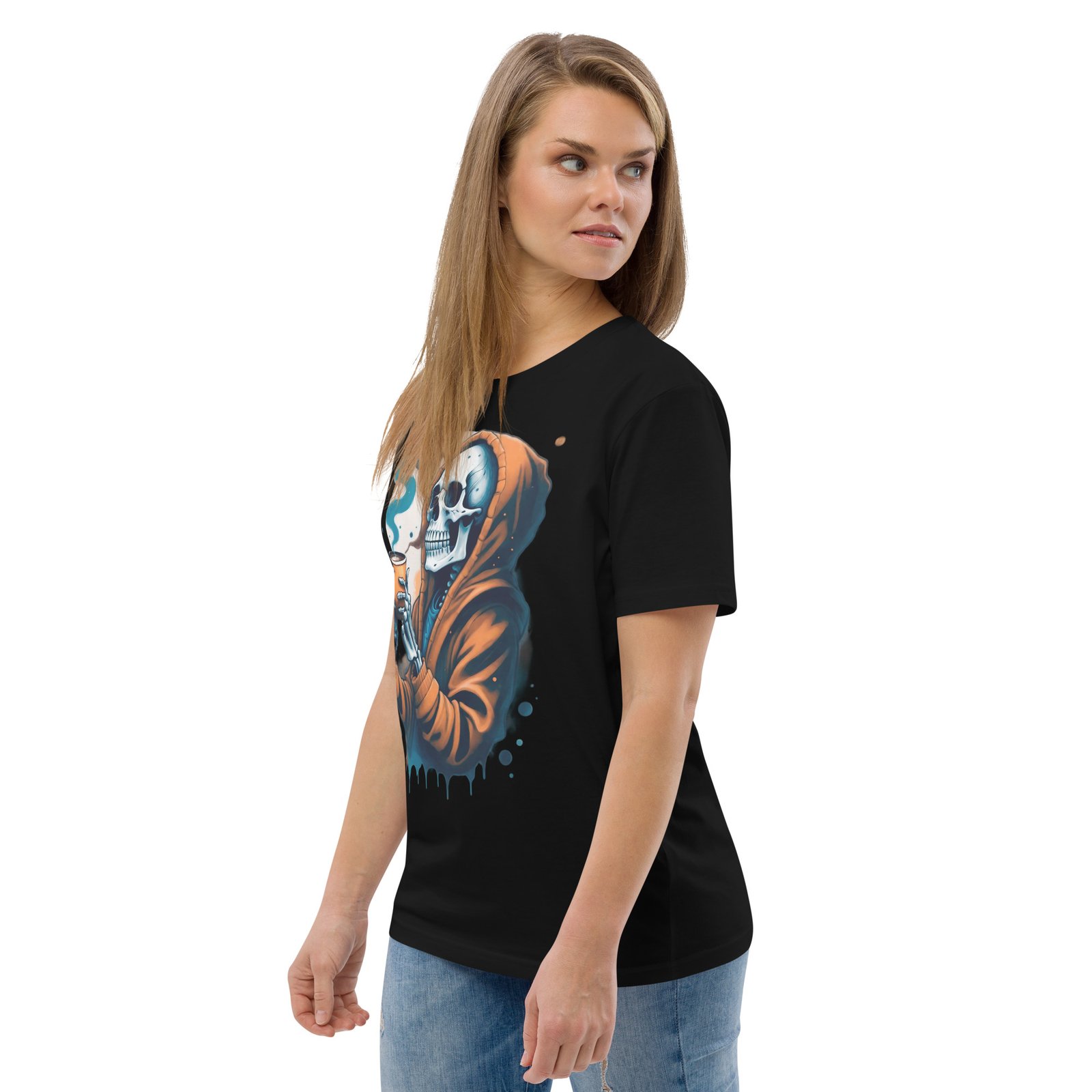 Disfruta de la oscuridad con estilo con nuestra camiseta ‘Café con la Muerte’. Este diseño presenta una calavera en una sudadera tomando una bebida caliente, perfecta para los amantes de lo macabro y el misterio. Con detalles sutiles de humo y tonos oscuros, esta camiseta es ideal para quienes quieren expresar su lado alternativo y relajado. Perfecta para la temporada de otoño o invierno, añade un toque de humor oscuro a tu estilo casual.
