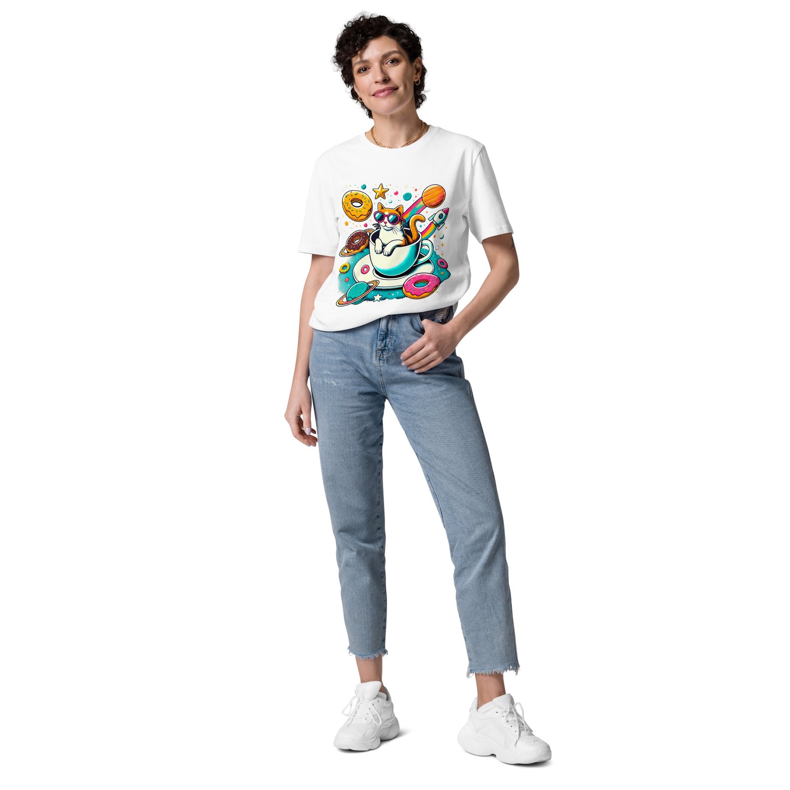 Déjate llevar al espacio con nuestra camiseta ‘Gato Cósmico en Taza de Donas’. Este encantador diseño muestra a un gato relajado en una taza de café, flotando entre planetas y donas en un universo lleno de color. Perfecta para amantes de los gatos, el café y lo surrealista, esta camiseta combina ternura y diversión. Ideal para añadir un toque de imaginación y dulzura cósmica a tu estilo diario.