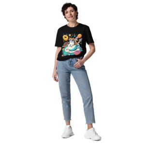 Atrévete a destacar con nuestra camiseta ‘Piña Vikinga en Trineo Espacial’. Este diseño surrealista muestra una piña con casco vikingo y martillo, viajando en un trineo de hot dog hacia la luna. Perfecta para quienes buscan una prenda única y divertida, esta camiseta mezcla humor y fantasía en un estilo fuera de este mundo. Ideal para espíritus creativos que disfrutan de lo inesperado y quieren agregar un toque de aventura cósmica a su look.
